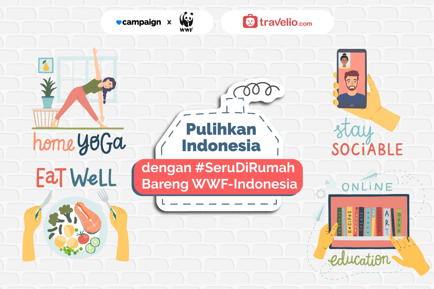 WWF-Indonesia and Campaign.com initiate the #SeruDiRumahBarengWWF campaign to support Indonesia's efforts to reduce the positive curve of COVID-19. We invite Indonesians to share their version of #SeruDiRumah (fun at home) activities for 7 days to protect themselves and their loved ones from the spread of COVID-19. The campaign successfully raised 1,438 actions from 843 people around Indonesia. This campaign resulted in the development and production of #BeliYangBaik educational materials on social media and the website www.beliyangbaik.org.