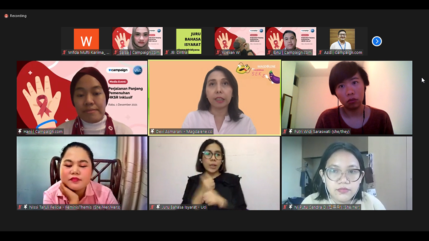 In commemoration of World AIDS Day 2021, Campaign.com with Sensitif VIVO held a media event, "Perjalanan Panjang Pemenuhan Hak Kesehatan Seksual dan Reproduksi Inklusif untuk Tekan Angka HIV/AIDS di Indonesia" (The Long Journey of Inclusive Sexual and Reproductive Health Rights Fulfillment to Reduce HIV/AIDS Rates in Indonesia), with Ni Putu Candra, Human Rights Lawyer & Founder of Bumi Setara, Devi Asmarani, Co-Founder and Chief Editor of Magdalene, Nissi Taruli Felicia, Founder of FeministThemis, and Putri Widi Saraswati, dr., MSc Sexual and Reproductive Health and Rights (SRHR) Expert, Researcher. This media event is a part of our campaign to invite people to take action to show solidarity for those living with HIV and help end the stigma attached to people living with HIV. I initiated the partnership with Tabu and Magdalene as well as co-host for the media event.
